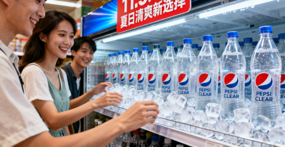 如今胖东来在售的透明可乐,正是泰国三得利百事可乐公司的最新力作,这家由日本三得利与美国百事合资的企业,2017年成立后就专注亚洲市场创新,今年9月其官方YouTube账号发布Pepsi Clear广告片,用“Be Real(真实)”到“Be Clear(透明)”的字幕转换,传递“更纯粹、更透明”的升级理念。广告中大量气泡特写、蓝白干净配色和快节奏电子音效,反复强化“清爽”感官体验,最终落点在“清爽起泡,真正可乐香”的宣传语上。泰国三得利百事可乐副总裁Laddawan Lertwasin也在社交平台强调:“这是可乐创新的突破,晶莹剔透的外观下,保留了零糖可乐的大胆清新味道,重新想象可乐的可能。”胖东来销售的这款产品原产地为泰国,瓶身贴有中文翻译标签,保质期约半年,正是靠着“经典味道+透明外观”的反差感,加上胖东来的渠道背书,才引发抢购热潮。而百事的老对手可口可乐也没掉队,2016年至2022年多次限时复刻透明可乐,2018年还在日本推出柠檬口味Coca-Cola Clear,墨西哥、日本等市场也有专属透明可乐产品,两大巨头的“透明博弈”从未停止。