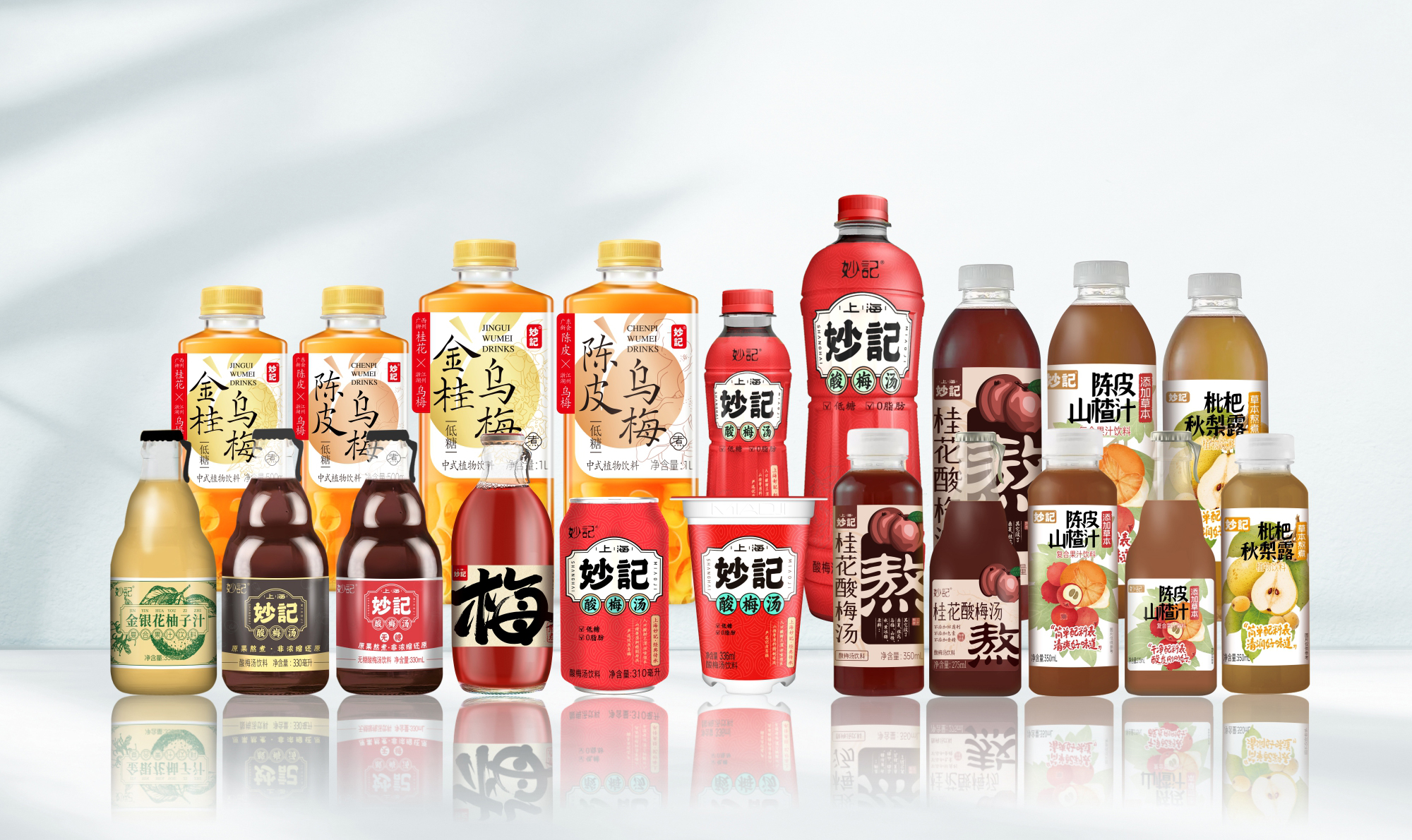 消费场景的多元化,驱动着品牌的创新升级。为精准匹配不同渠道、不同人群的消费需求,妙记构建了全维度的产品矩阵与规格体系。在包装规格上,覆盖口杯装、拉罐装、PET瓶、玻璃瓶装,310ml/330ml/500ml/1L等,以及金桂乌梅、陈皮乌梅、梅饮、桂花酸梅汤等不同规格、不同大小、不同口味的酸梅汤全场景形态。