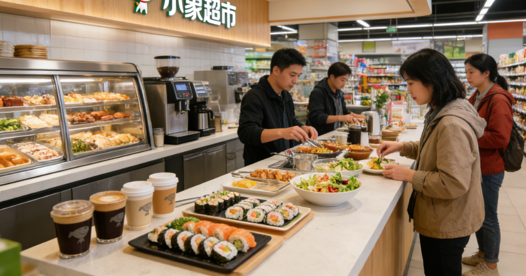 此次宁波店的落地,并非临时布局,而是美团酝酿已久的线下重启战略,更是对“1+N”(线下大店+前置仓)模式的深化落地。作为美团旗下核心自营即时零售业务,小象超市的前身为2019年1月推出的美团买菜,2023年底完成品牌升级,定位“30分钟快送超市”,聚焦生鲜食杂日用及即时配送服务,目前已在全国20个城市布局近1000家前置仓,按单量计算稳居中国自营前置仓生鲜到家市场第一,日均订单量突破200万单,线上根基已然稳固。而线下大店则承担着多重核心职能,既是品牌形象的体验中心,为消费者提供沉浸式购物场景,也是新品的试验场,可快速捕捉市场反馈优化商品结构,同时作为区域履约枢纽,联动周边前置仓提升配送效率。店内重点打造的3R食品区(即热、即食、即烹)与占比30%-40%的自有品牌,延续了北京首店的核心吸引力,精准契合当下消费者对便捷、高性价比品质食材的需求,开业即火爆的北京首店也为宁波店的运营提供了成熟范本。