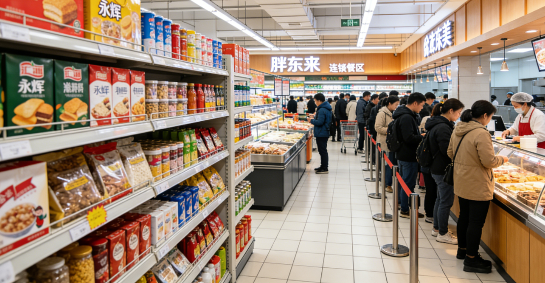 连锁餐饮之所以扎堆涌入社区超市,本质上是一场双赢的布局,更是双方突破自身发展瓶颈的必然选择。如今的社区客群,消费需求早已跳出“买东西”“吃顿饭”的单一维度,周边居民既需要便捷的日常采购渠道、高性价比的就餐选择,也渴望在近距离范围内实现“逛、吃、买”的一站式消费体验,而永辉、物美等商超与连锁餐饮的深度融合,恰好完美契合了这一消费需求的升级。对于餐饮品牌而言,入驻社区超市,无疑是低成本、高效率扎根社区的最优路径。当下的社区餐饮赛道早已告别“开个小店就能赚钱”的蓝海,进入拼品牌、拼效率、拼性价比的红海竞争,而商超改造释放的黄金位置,不仅省去了餐饮品牌寻找优质选址的麻烦,更能借助商超成熟的物业配套,规避社区店繁琐的开业流程,降低用火用电、装修等合规与运营成本,让品牌能够快速落地扎根。与此同时,胖东来、永辉、物美等头部商超自带稳定的家庭与社区客流,餐饮品牌入驻后,无需投入巨额资金投放广告、铺设门店,就能获得精准匹配的稳定客流,大大降低了获客成本;依托商超的品牌背书,餐饮品牌还能快速获得社区居民的认可,尤其是新品牌、网红品牌,可借助商超场景快速打开本地市场,积累品牌口碑。更重要的是,商超强大的生鲜直采、中央厨房与库存管理体系,能为餐饮品牌提供坚实的供应链支撑,帮助餐饮品牌降低采购与运营成本,提升菜品品质的稳定性,实现降本增效。据《社区餐饮专题研究报告》显示,目前社区餐饮以中式快餐、简餐、小吃、轻正餐为主流业态,而那些主打高性价比、能兼容堂食、外带、外卖多经营形态的品牌,在商超场景中更具竞争优势,也更容易获得消费者的青睐。
