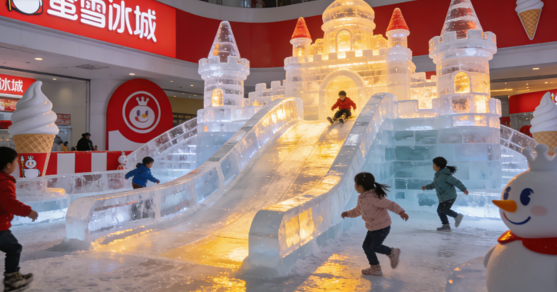 此次打造的 “雪王室内乐园”,并非简单的游乐场所,而是蜜雪冰城构建品牌生态、拓展消费场景的核心载体,其规划理念与场景设计彰显了品牌的创新思维与战略眼光。乐园以 “雪王” IP 为核心,打造充满甜蜜与奇幻的冰雪世界,规划多个室内主题体验区,涵盖冰雪游乐、互动打卡、主题餐饮、周边零售等多元业态,让消费者在游玩过程中,全方位感受 “雪王” 的魅力与蜜雪冰城的品牌文化。更具特色的是,乐园深度融合了蜜雪冰城全球总部、全球旗舰店与主题乐园三大场景,实现了 “总部办公 + 品牌展示 + 消费体验” 的深度联动,消费者不仅可以在乐园中畅玩冰雪项目,还能走进全球旗舰店,选购最新款的蜜雪冰城产品与周边,甚至有机会近距离了解品牌的运营模式与产品研发过程,形成 “游玩 + 购物 + 体验” 三位一体的沉浸式体验体系,彻底打破了传统茶饮品牌与消费者之间的边界。