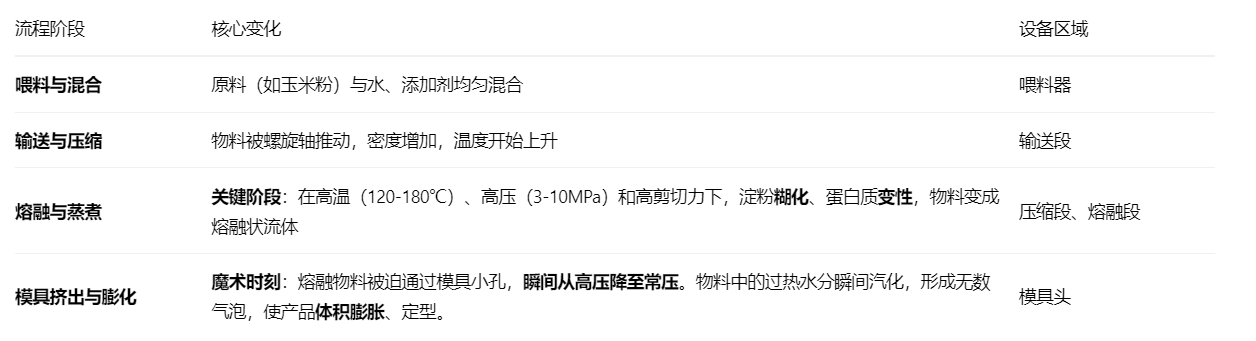 其核心是一个物理化学过程,可以概括为:混合 → 蒸煮 → 成型 → 膨化 的一体化流程。