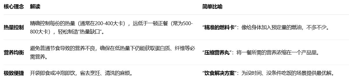 核心精髓:代餐不是普通的零食,而是经过科学设计的 “营养包” 。它用标准化的方式,解决特定场景下的饮食需求,核心特征是 “高营养密度、低热量”。