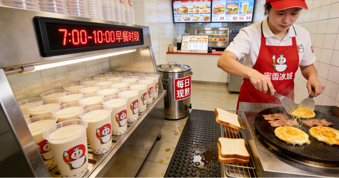 这场早餐业务的试水,是蜜雪冰城拓展消费场景、提升门店坪效的战略布局。对于新茶饮行业而言,上午通常是客流低谷期,而早餐时段恰好能弥补这一空白,延长门店有效经营时长。蜜雪冰城 4.6 万余家门店中,57.4% 分布在三线及以下城市,且广泛覆盖社区、校园、商业街等多元场景,尤其是通勤要道的门店,能精准捕捉早高峰客流。《中国居民早餐饮食状况调查报告》显示,81% 的受访者早餐用时在 15 分钟内,“便捷性” 成为核心需求,这与蜜雪冰城 “即买即走” 的服务模式高度契合。通过新增早餐业务,品牌不仅能提升设备利用率和店员工作效率,还能吸引新客群、增强老客粘性,实现 “一杯奶茶 + 一份早餐” 的消费场景延伸,为门店带来新的增长曲线。