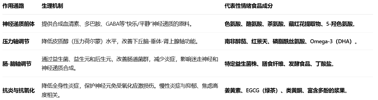 情绪食品 是指那些含有经过科学验证的特定生物活性成分,能够通过调节大脑神经递质、激素水平、肠道菌群或系统性炎症等生理途径,从而对人的情绪、压力反应、认知功能或心理健康产生积极、可感知的改善作用**的食品、饮料或膳食补充剂。
